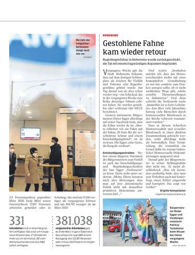 Regenbogenfahne in Hohenems wurde zurückgeschickt, die Tat mit einem fragwürdigen Argument begründet.