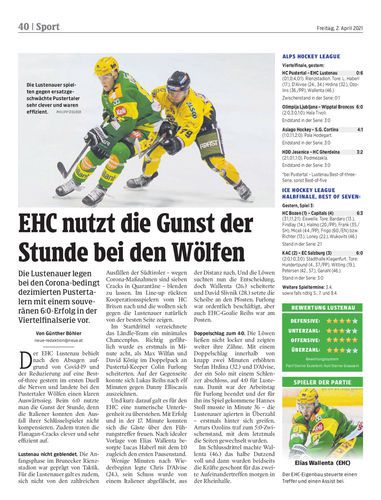 Die Lustenauer legen bei den Corona-bedingt dezimierten Pustertalern mit einem souveränen 6:0-Erfolg in der Viertelfinalserie vor.