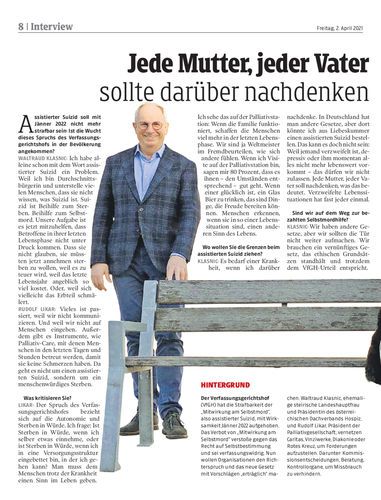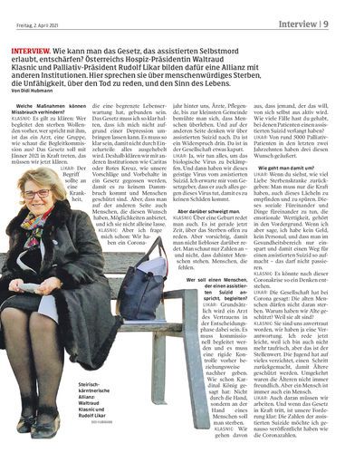 Wie kann man das Gesetz, das assistierten Selbstmord erlaubt, entschärfen? Österreichs Hospiz-Präsidentin Waltraud Klasnic und Palliativ-Präsident Rudolf Likar bilden dafür eine Allianz mit anderen Institutionen. Hier sprechen sie über menschenwürdiges Sterben, die Unfähigkeit, über den Tod zu reden, und den Sinn des Lebens. Von Didi Hubmann