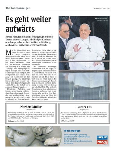 Neues Röntgenbild zeigt Rückgang der Infektionen an den Lungen. 88-jähriges Kirchenoberhaupt arbeitet laut Vatikanmitteilung auch wieder zeitweise am Schreibtisch.