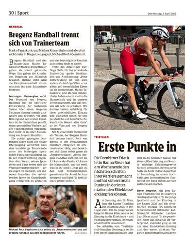 Die Dornbirner Triathletin Hanna Röser hat am Wochenende den nächsten Schritt in ihrer Karriere gemacht und hat sich erstmals Punkte in der interntationalen Eliteklasse erkämpfen können.