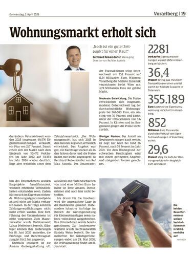 Nach schwachen Jahren zeigt der Wohnungsmarkt in Vorarlberg 2025 wieder nach oben. Der aktuelle „ImmoSpiegel“ von Re/Max weist eine deutlich gestiegene Zahl an Verkäufen aus.