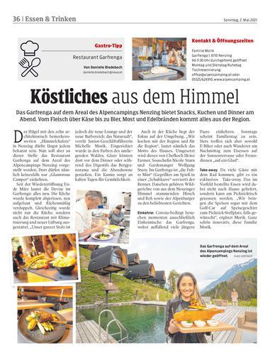 Das Garfrenga auf dem Areal des Alpencampings Nenzing bietet Snacks, Kuchen und Dinner am Abend. Vom Fleisch über Käse bis zu Bier, Most und Edelbränden kommt alles aus der Region.