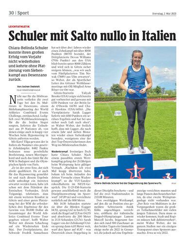 Chiara-Belinda Schuler konnte ihren großen Erfolg vom Vorjahr nicht wiederholen und kehrte ohne Platzierung vom Siebenkampf aus Desenzano zurück.
