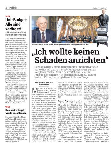 Der ehemalige Verteidigungsminister Norbert Darabos verteidigt vor dem Untersuchungsausschuss seinen Vergleich mit EADS und bestreitet, dass es eine Ausstiegsmöglichkeit gegeben habe. Sein Gutachter, Helmut Koziol, bestätigt diese Sicht der Dinge.