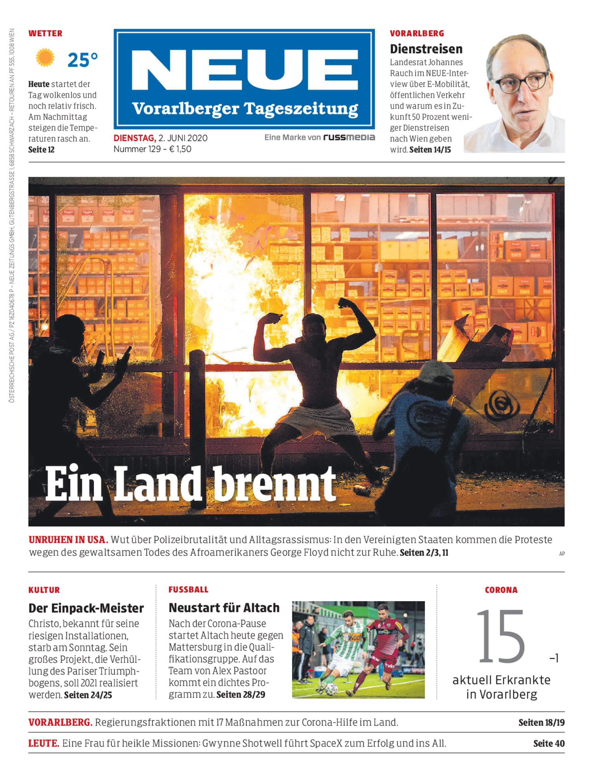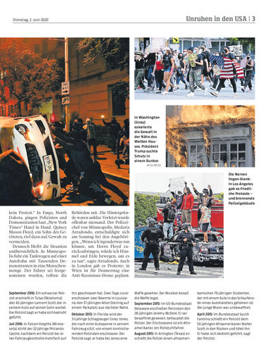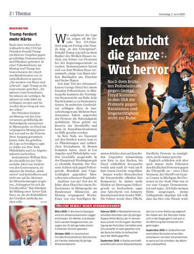 Unruhen in USA. Wut über Polizeibrutalität und Alltagsrassismus: In den Vereinigten Staaten kommen die Proteste wegen des gewaltsamen Todes des Afroamerikaners George Floyd nicht zur Ruhe. Seiten 2/3, 11 AP