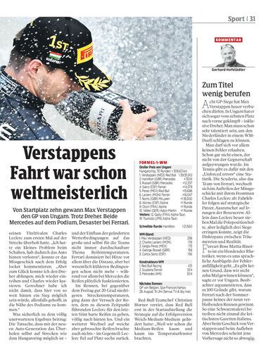 Von Startplatz zehn gewann Max Verstappen den GP von Ungarn. Trotz Dreher. Beide Mercedes auf dem Podium, Desaster bei Ferrari.