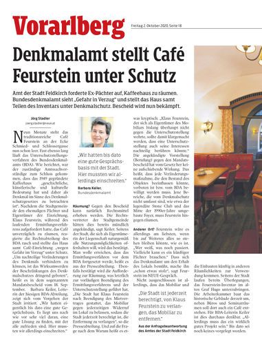 Amt der Stadt Feldkirch forderte Ex-Pächter auf, Kaffeehaus zu räumen. Bundesdenkmalamt sieht „Gefahr in Verzug“ und stellt das Haus samt Teilen des Inventars unter Denkmalschutz. Bescheid wird nun bekämpft.