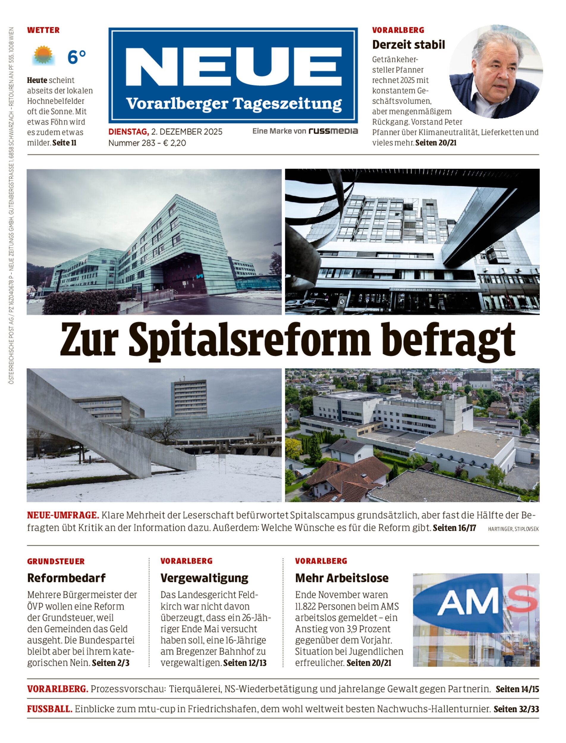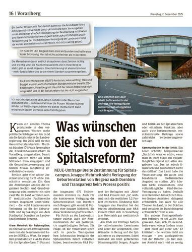 NEUE-Umfrage: Breite Zustimmung für Spitalscampus, knappe Mehrheit sieht Verlegung der Geburtenstation von Bregenz nach Dornbirn und Transparenz beim Prozess positiv.