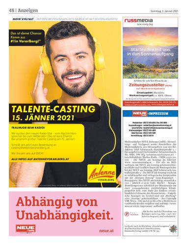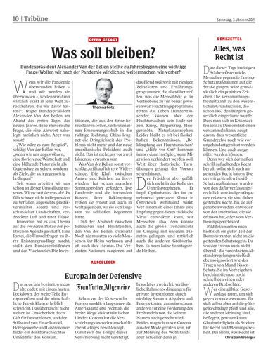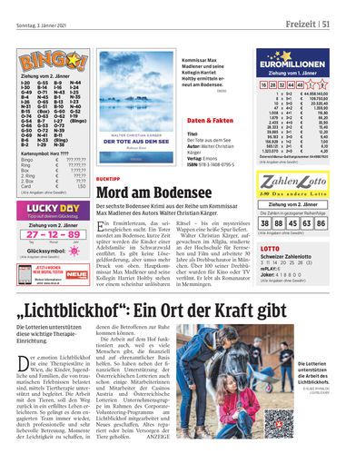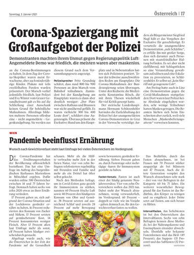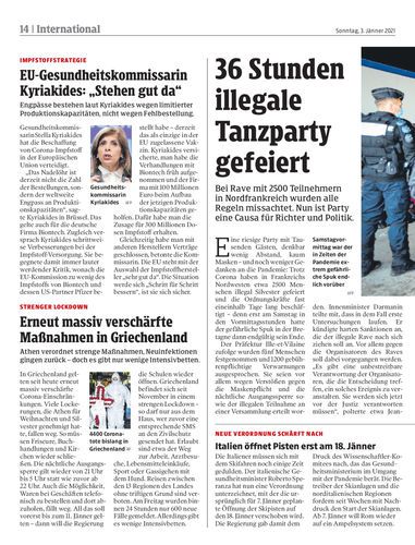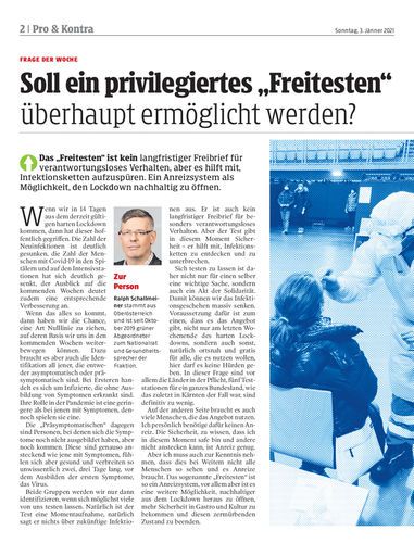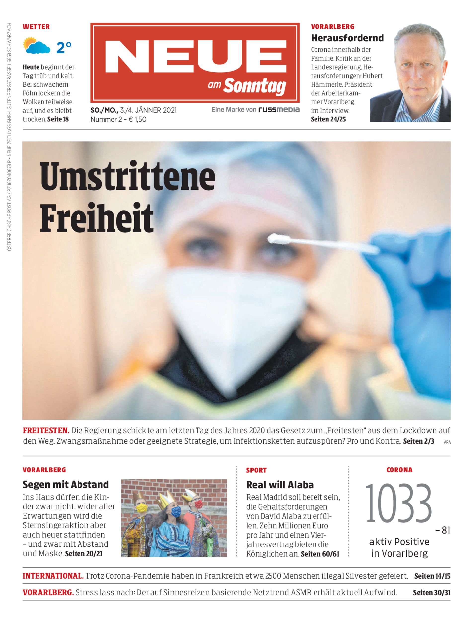 Freitesten. Die Regierung schickte am letzten Tag des Jahres 2020 das Gesetz zum „Freitesten“ aus dem Lockdown auf den Weg. Zwangsmaßnahme oder geeignete Strategie, um Infektionsketten aufzuspüren? Pro und Kontra. Seiten 2/3 APA