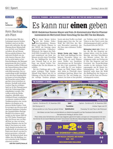 NEUE-Redakteur Hannes Mayer und Puls-24-Kommentator Martin Pfanner nominieren im Wettstreit ihren Vorschlag für das DEC-Tor des Monats.