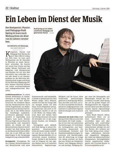 Der Komponist, Pianist und Pädagoge Rudi Spring ist kurz nach Weihnachten im Alter von 63 Jahren verstorben.