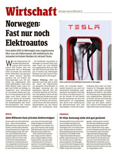 Fast jeder 2025 in Norwegen neu zugelassene Pkw war ein Elektroauto. Die beliebteste Automarke im hohen Norden ist aktuell Tesla.