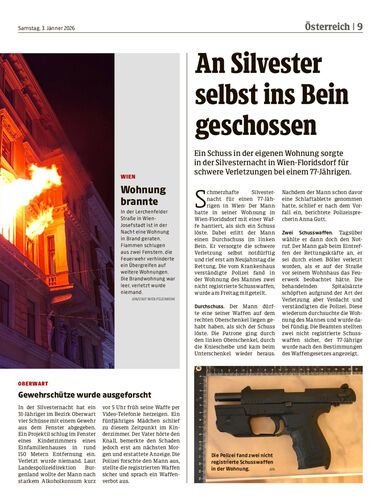 Ein Schuss in der eigenen Wohnung sorgte in der Silvesternacht in Wien-Floridsdorf für schwere Verletzungen bei einem 77-Jährigen.
