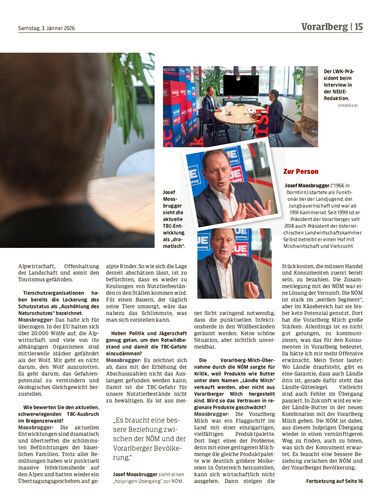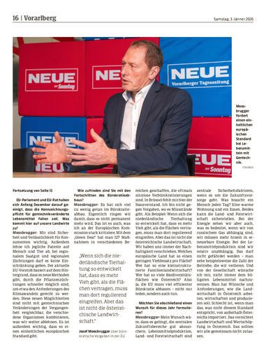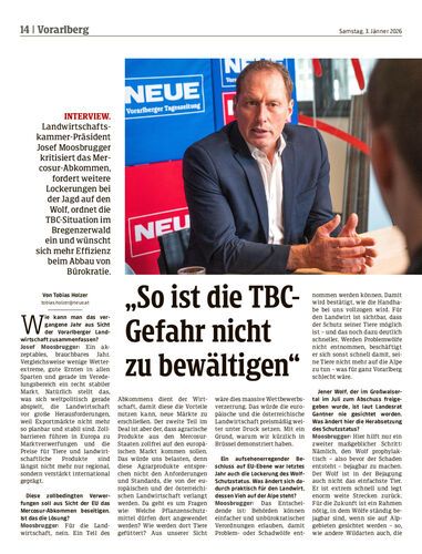 Interview. Landwirtschaftskammer-Präsident Josef Moosbrugger kritisiert das Mercosur-Abkommen, fordert weitere Lockerungen bei der Jagd auf den Wolf, ordnet die TBC-Situation im Bregenzerwald ein und wünscht sich mehr Effizienz beim Abbau von Bürokratie.