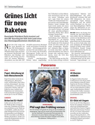 Russlands Präsident Putin kontert auf den INF-Ausstieg der USA: Sein Land setze das Rüstungsabkommen ebenfalls aus.