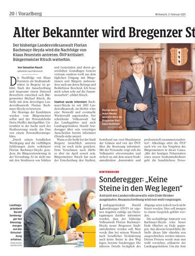 Der bisherige Landesvolksanwalt Florian Bachmayr-Heyda wird die Nachfolge von Klaus Feurstein antreten. ÖVP kritisiert Bürgermeister Ritsch weiterhin.