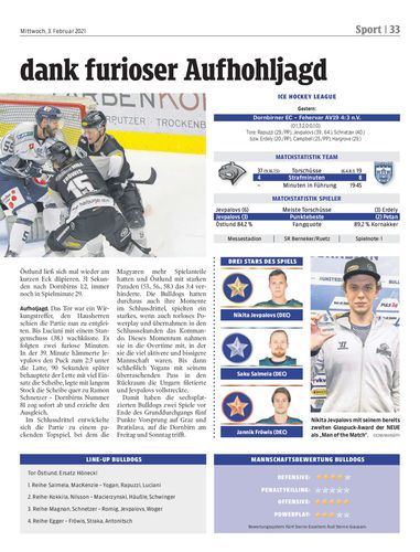 Spielbericht. Die Dornbirner schlagen Fehervar nach einem 0:2- und 1:3-Rückstand noch mit 4:3 in der Verlängerung. Die Bulldogs beweisen dabei nicht nur große Moral, sondern auch große Klasse.