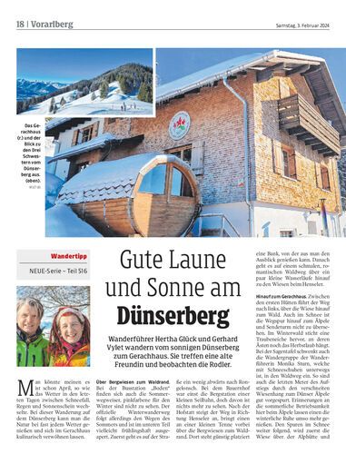 Wanderführer Hertha Glück und Gerhard Vylet wandern vom sonnigen Dünserberg zum Gerachhaus. Sie treffen eine alte Freundin und beobachten die Rodler.