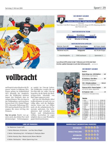 Spielbericht. Die Pioneers Vorarlberg stehen vor der Qualifikation für die Pre-Play-offs. Die Feldkircher gewannen gestern mit 6:2 gegen Asiago, gleichzeitig verloren die Caps mit 1:2.