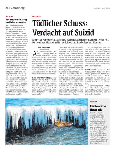 Ermittler vermuten, dass sich 53-jährige Lustenauerin am Mittwoch mit Pistole ihres Mannes selbst gerichtet hat. Ergebnisse am Montag.