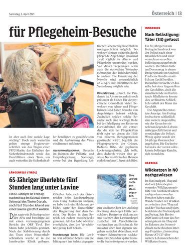Ein 65-Jähriger ist Freitag-nachmittag im Sulztal, einem Seitental des Tiroler Ötztals, nach fünf Stunden lebend aus einer Lawine gerettet worden.