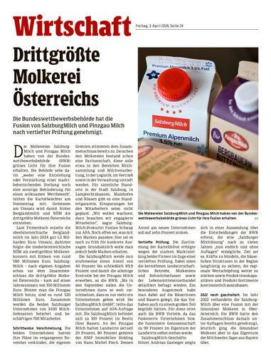 Fusion von SalzburgMilch und Pinzgau Milch nach vertiefter Prüfung genehmigt.
