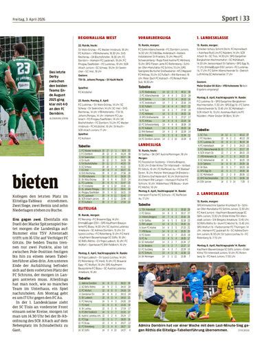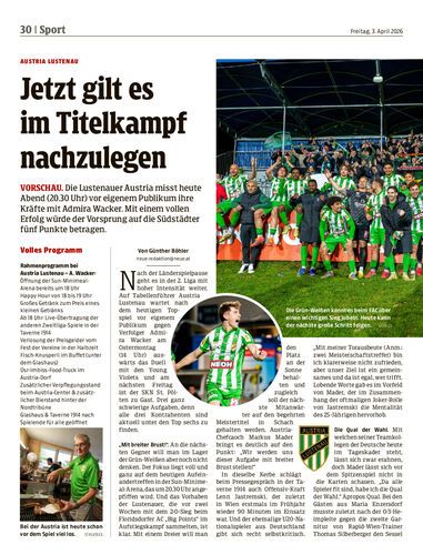 Vorschau. Die Lustenauer Austria misst heute Abend (20.30 Uhr) vor eigenem Publikum ihre Kräfte mit Admira Wacker. Mit einem vollen Erfolg würde der Vorsprung auf die Südstädter fünf Punkte betragen.