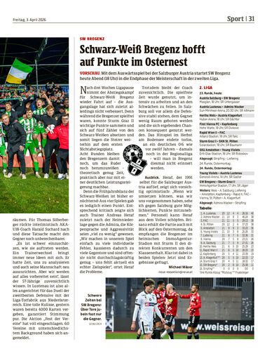 Vorschau. Mit dem Auswärtsspiel bei der Salzburger Austria startet SW Bregenz heute Abend (18 Uhr) in die Endphase der Meisterschaft in der zweiten Liga.