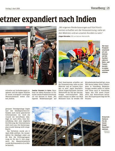 Getzner Werkstoffe baut seine internationale Präsenz weiter aus. Das Vorarlberger Unternehmen mit Hauptsitz in Bürs eröffnet nun seinen ersten Standort in Indien.