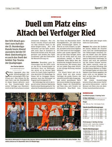 Der SCR Altach gastiert zum Auftakt der 25. Bundesliga-Runde heute Abend auswärts bei der SV Ried. Gleichzeitig ist es auch das Duell der beiden Top-Teams der Qualigruppe.