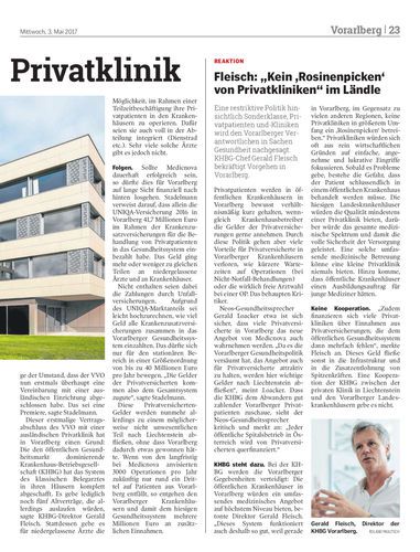 Eine restriktive Politik hinsichtlich Sonderklasse, Privatpatienten und-Kliniken wird den Vorarlberger Verantwortlichen in Sachen Gesundheit nachgesagt. KHBG-Chef Gerald Fleisch bekräftigt Vorgehen in Vorarlberg.