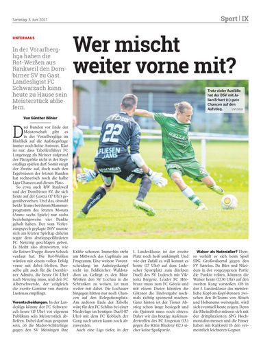 In der Vorarlbergliga haben die Rot-Weißen aus Rankweil den Dornbirner SV zu Gast. Landesligist FC Schwarzach kann heute zu Hause sein Meisterstück abliefern.