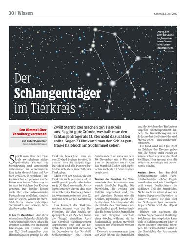 Zwölf Sternbilder machen den Tierkreis aus. Es gibt gute Gründe, weshalb man den Schlangenträger als 13. Sternbild dazuzählen sollte. Gegen 23 Uhr kann man den Schlangenträger halbhoch am Südhimmel sehen.