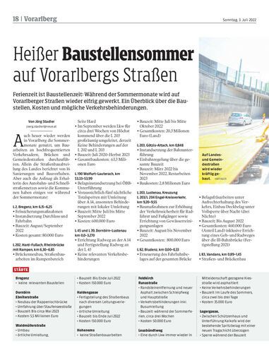 Ferienzeit ist Baustellenzeit: Während der Sommermonate wird auf Vorarlberger Straßen wieder eifrig gewerkt. Ein Überblick über die Baustellen, Kosten und mögliche Verkehrsbehinderungen.