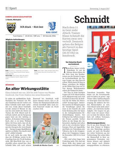 Nach dem 1:1 in Gent sieht Altach-Trainer Klaus Schmidt die Karten zwar neu verteilt. Dennoch gehen die Belgier als Favorit in das heutige Spiel (20.30 Uhr) in Innsbruck.