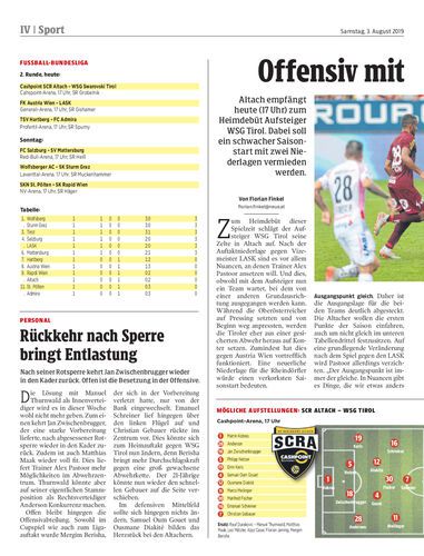 Altach empfängt heute (17 Uhr) zum Heimdebüt Aufsteiger WSG Tirol. Dabei soll ein schwacher Saisonstart mit zwei Niederlagen vermieden werden.