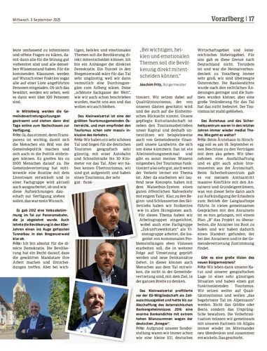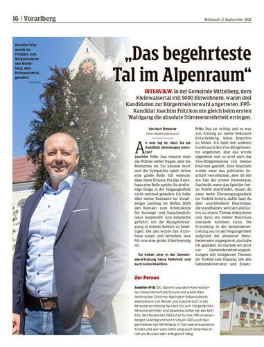 Interview. In der Gemeinde Mittelberg, dem Kleinwalsertal mit 5000 Einwohnern, waren drei Kandidaten zur Bürgermeisterwahl angetreten. FPÖ-Kandidat Joachim Fritz konnte gleich beim ersten Wahlgang die absolute Stimmenmehrheit erringen.