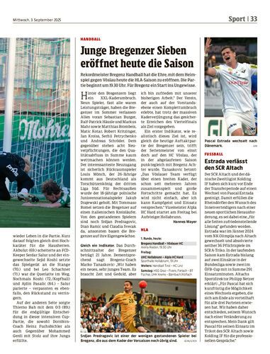 Rekordmeister Bregenz Handball hat die Ehre, mit dem Heimspiel gegen Vöslau heute die HLA-Saison zu eröffnen. Die Partie beginnt um 19.30 Uhr. Für Bregenz ein Start ins Ungewisse.
