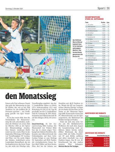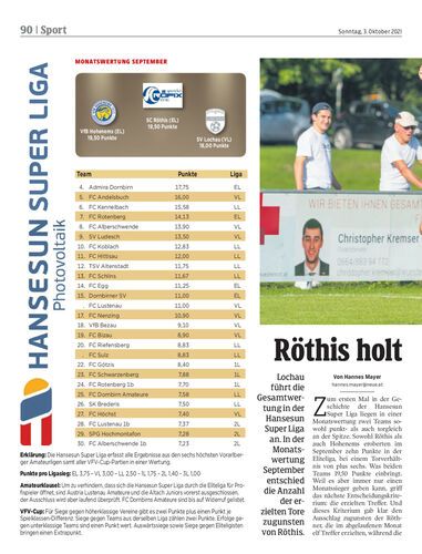 Lochau führt die Gesamtwertung in der Hansesun Super Liga an. In der Monatswertung September entschied die Anzahl der erzielten Tore zugunsten von Röthis.