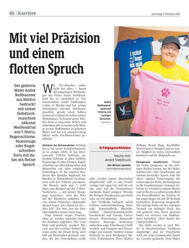 Der gelernte Maler André Nußbaumer aus Höchst bedruckt mit seiner Siebdruckmaschine akkurat Werbemittel wie T-Shirts, Regenschirme, Feuerzeuge oder Kugelschreiber. Stets mit dabei: ein flotter Spruch.