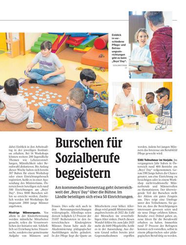 Am kommenden Donnerstag geht österreichweit der „Boys’ Day“ über die Bühne. Im Ländle beteiligen sich etwa 50 Einrichtungen.