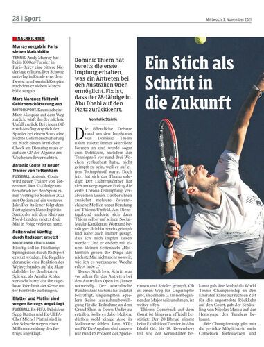 Dominic Thiem hat bereits die erste Impfung erhalten, was ein Antreten bei den Australien Open ermöglicht. Fix ist, dass der 28-Jährige in Abu Dhabi auf den Platz zurückkehrt.