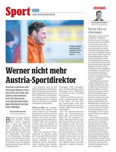 Trennung. Christian Werner ist ab Jänner nicht mehr Sportdirektor bei Austria Lustenau. Der ursprünglich bis Sommer 2020 laufende Vertrag des Deutschen wird in beiderseitigem Einvernehmen aufgelöst. Sportteil Philipp Steurer