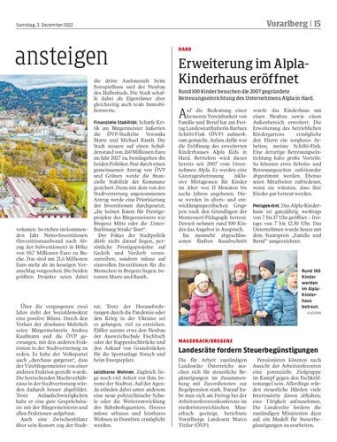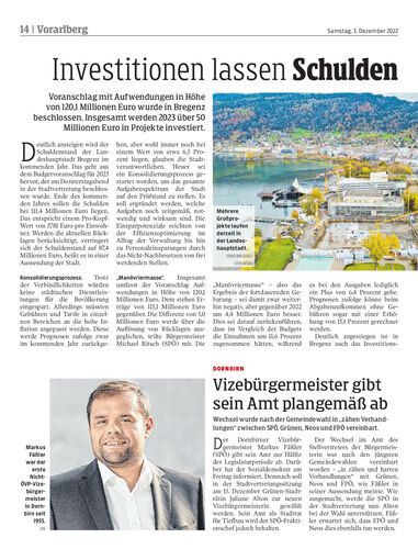 Voranschlag mit Aufwendungen in Höhe von 120,1 Millionen Euro wurde in Bregenz beschlossen. Insgesamt werden 2023 über 50 Millionen Euro in Projekte investiert.