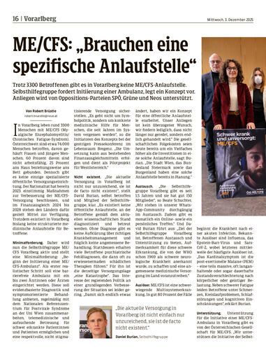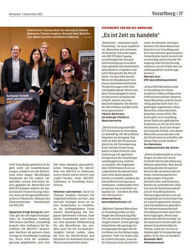 Trotz 3300 Betroffenen gibt es in Vorarlberg keine ME/CFS-Anlaufstelle. Selbsthilfegruppe fordert Initiierung einer Ambulanz, legt ein Konzept vor. Anliegen wird von Oppositions-Parteien SPÖ, Grüne und Neos unterstützt.