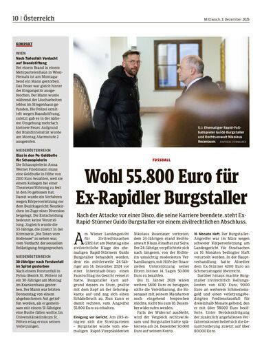 Nach der Attacke vor einer Disco, die seine Karriere beendete, steht Ex-Rapid-Stürmer Guido Burgstaller vor einem zivilrechtlichen Abschluss.