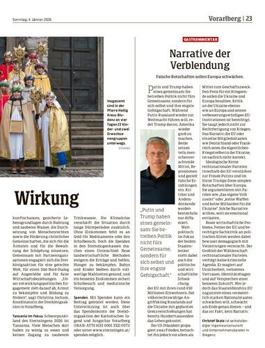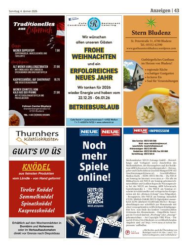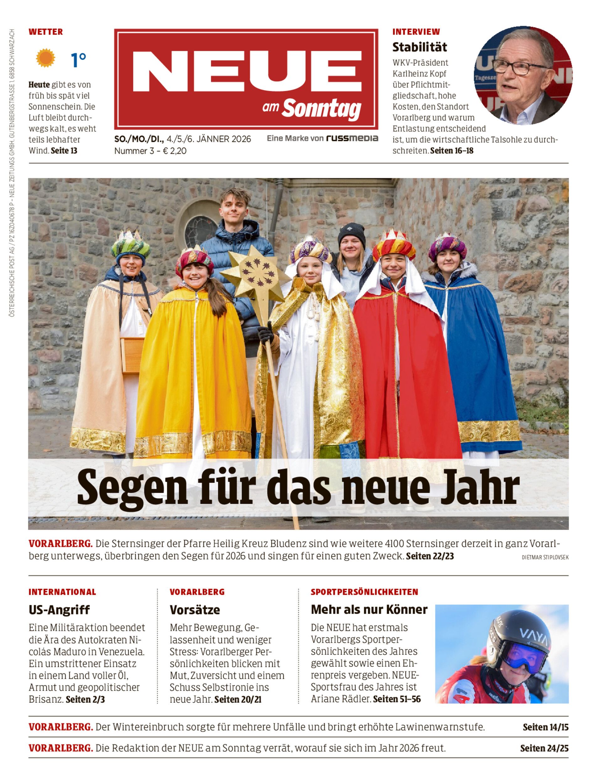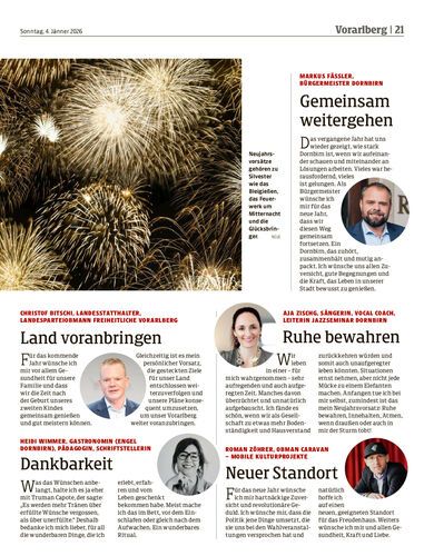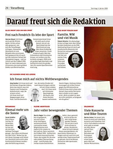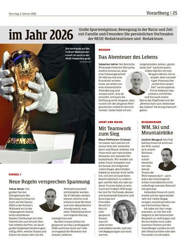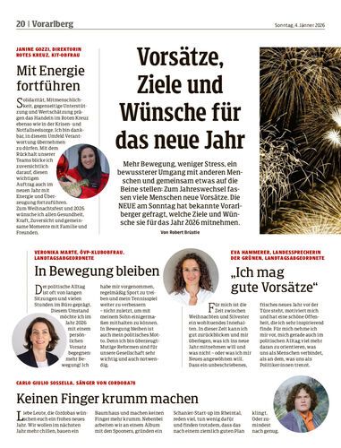Mehr Bewegung, weniger Stress, ein bewussterer Umgang mit anderen Menschen und gemeinsam etwas auf die Beine stellen: Zum Jahreswechsel fassen viele Menschen neue Vorsätze. Die NEUE am Sonntag hat bekannte Vorarlberger gefragt, welche Ziele und Wünsche sie für das Jahr 2026 mitnehmen.