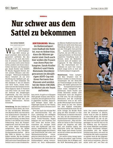 Hintergrund. Wenn im Hallenradsport vom Radball die Rede ist, war es bisher klar, dass die Männer gemeint sind. Doch auch hier wollen die Frauen nun ihren Platz behaupten. Sarah Kraller (Höchst) und Frieda Rümmele (Dornbirn) gewannen im diesjährigen ASVÖ-Cup mit ihren Partnern ihre Klassen und werden bei der Heim-EM 2026 in Höchst als ein Team auftreten.