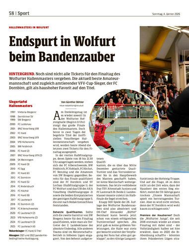 Hintergrund. Noch sind nicht alle Tickets für den Finaltag des Wolfurter Hallenmasters vergeben. Die aktuell beste Amateurmannschaft und zugleich amtierender VFV-Cup-Sieger, der FC Dornbirn, gilt als haushoher Favorit auf den Titel.